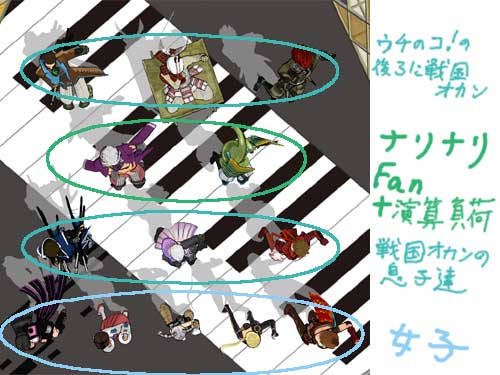 ざっとしたカテゴリは上の画像の通りなのですが、女子は初め鶴ちゃんとかすがの位置が逆でした。センターをいつきちゃんに、両脇をお市と孫市にすることは決めていたので、とりあえず、という事で置いてみたところ、画面左が全体的に暗く、そして右側が赤っぽくなってしまった為です。