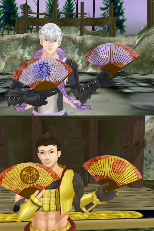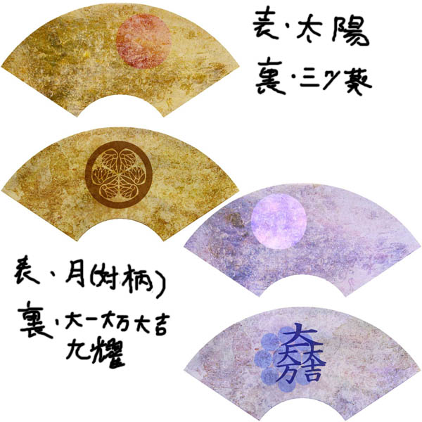 全体のデザインは家康が実際に使っていた軍扇の『金銀日月星図』というものから貰い、右を東、左を西と見立てて、家康は昇る太陽、ということで右よりに太陽を配置し、三成は隠れる(亡くなるの隠語的な意味で)月という事で左寄りに月を配置しました。