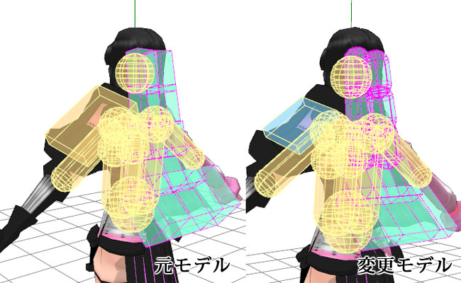 何故引っかかるのだろう?と再生したり『常に演算』等でコマ送りしながら考えていて、ふと動いた拍子に鋼体と鋼体の間を抜けた(もしくは腕などの鋼体のない場所から回り込んだ)鋼体が、次のモーションに移った時に他の鋼体に挟みこまれて抜けれずに残っているのではないかと思ったので、比較的鋼体の形を変えても問題のなさそうな上3段を変更(※1)、腕や背に直接的に当たる4・5の鋼体は引っかかり軽減のために薄く(※2)、左肩の方へ顔を向けた時に引っかかって回り込む事が多かったため、楯鋼体をほぼ軸部分のみに変更(※3)させて頂きました。