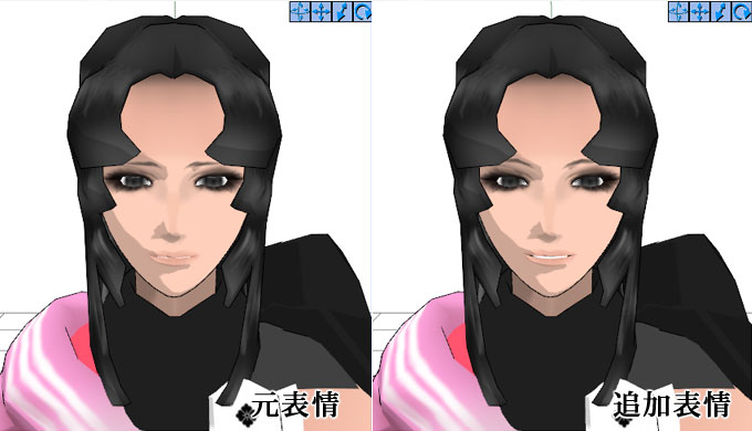 これに、もう一つ作った目(大)を組み合わせたものに、若干下向きに両目のボーンをキー操作して、笑うおひい様を作っています。